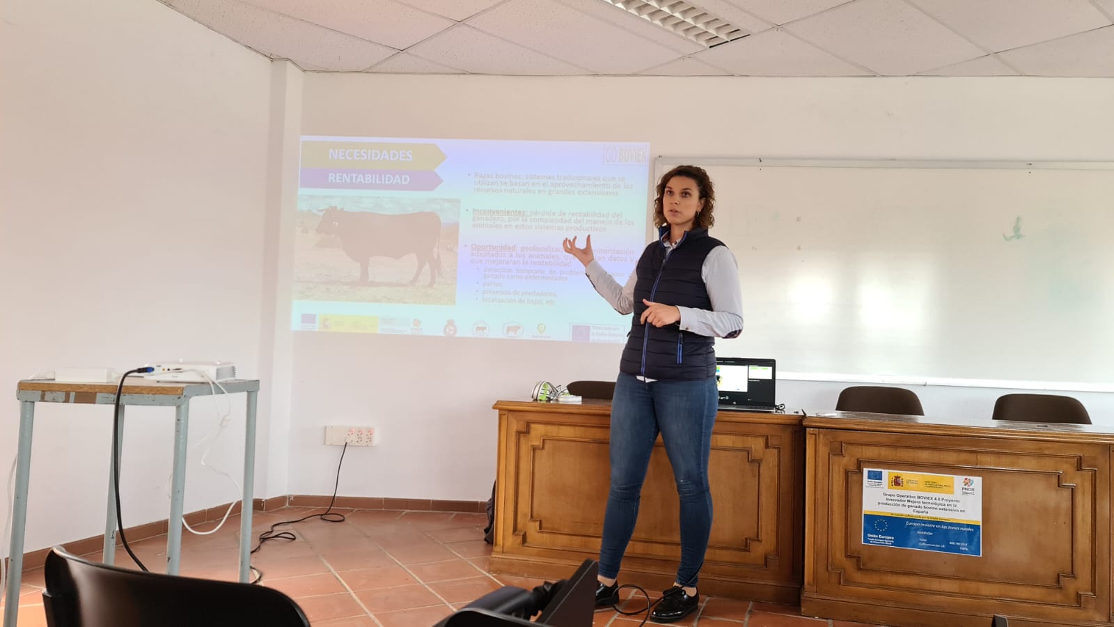 La Jornada dio comienzo a las 11:00 de la mañana y arrancó con la charla de Carla Marcos, del departamento técnico de la Real Federación Española de Asociaciones de Ganado Selecto (RFEAGAS), que fue la encargada de explicar las actividades que se han llevado a cabo desde los inicios de este proyecto, que tiene por objetivos mejorar la rentabilidad de las explotaciones de vacuno extensivas mediante una herramienta que mejorará su eficiencia productiva minimizando las pérdidas al menor coste posible; mejorar la gestión de las explotaciones, detectando signos clínicos o fisiológicos que permitan actuar de forma rápida, aumentando la productividad de las ganaderías; mejorar la gestión del pastoreo y la calidad de vida de los ganaderos con herramientas competitivas y dar valor añadido a las producciones extensivas.